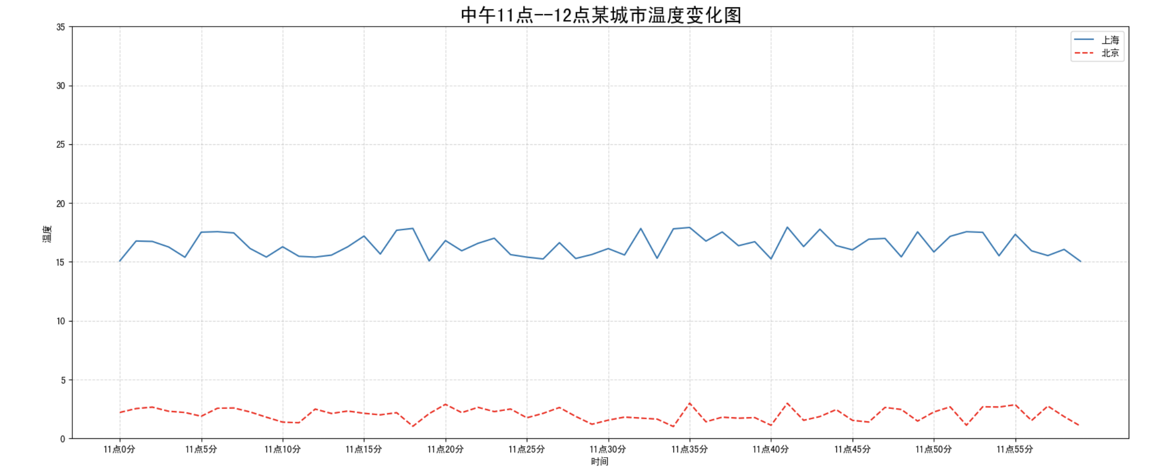 # plt.title("中午11点--12点某城市温度变化图", fontsize=20)