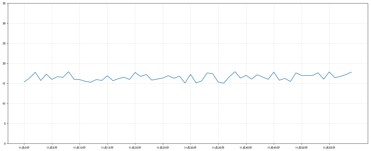 需求:画出某城市11点到12点1小时内每分钟的温度变化折线图,温度范围在15度~18度